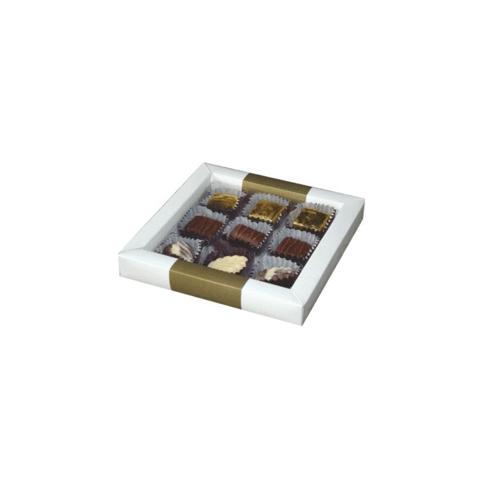 Caixa 9 bombons com borda e cinta colorida em papel duplex e berço cristal