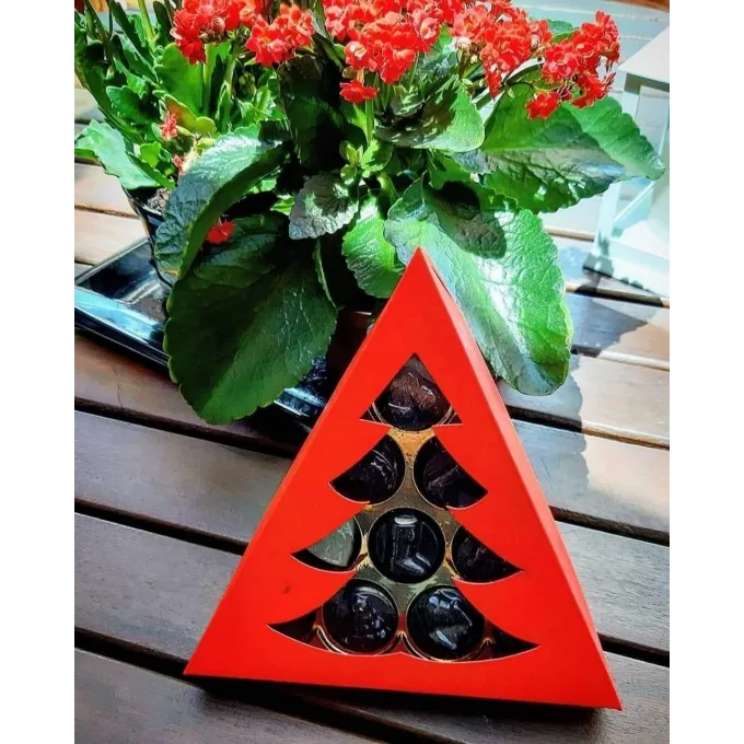 Caixa 9 bombons com borda em papel duplex estampado, berço ouro metalizado e detalhe em feltro