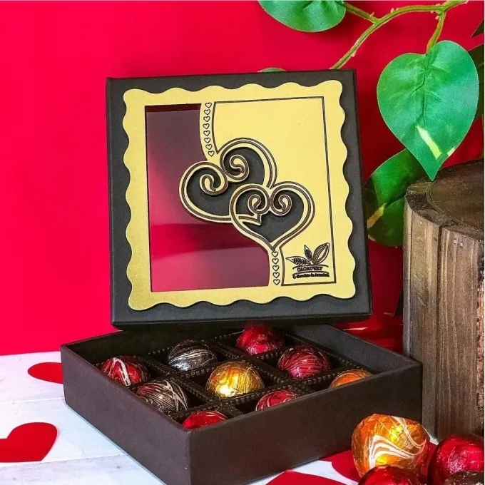 Caixa 9 Bombons em papelão Rígido com recorte á laser e aplique em MDF