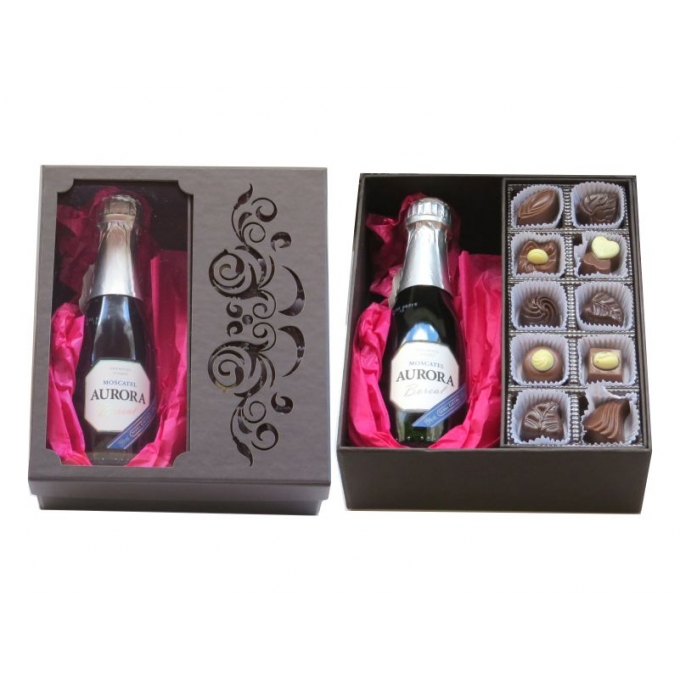 Caixa para mini espumante + 10 Bombons em papelão Rígido com recorte á laser