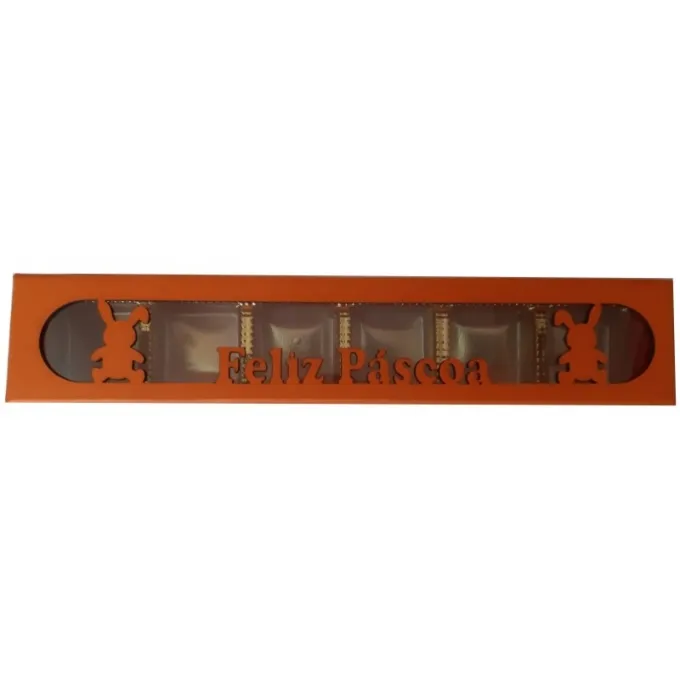Caixa 06 Bombons comprida em papelão rígido, recorte a laser e berço ouro metalizado