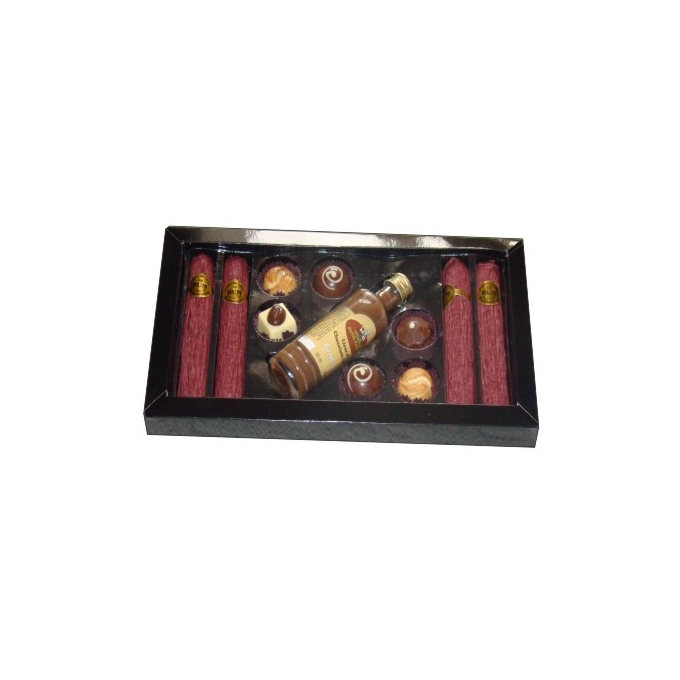 Caixa 4 Charutos + 06 Bombons + mini garrafa em papel duplex e berço marrom