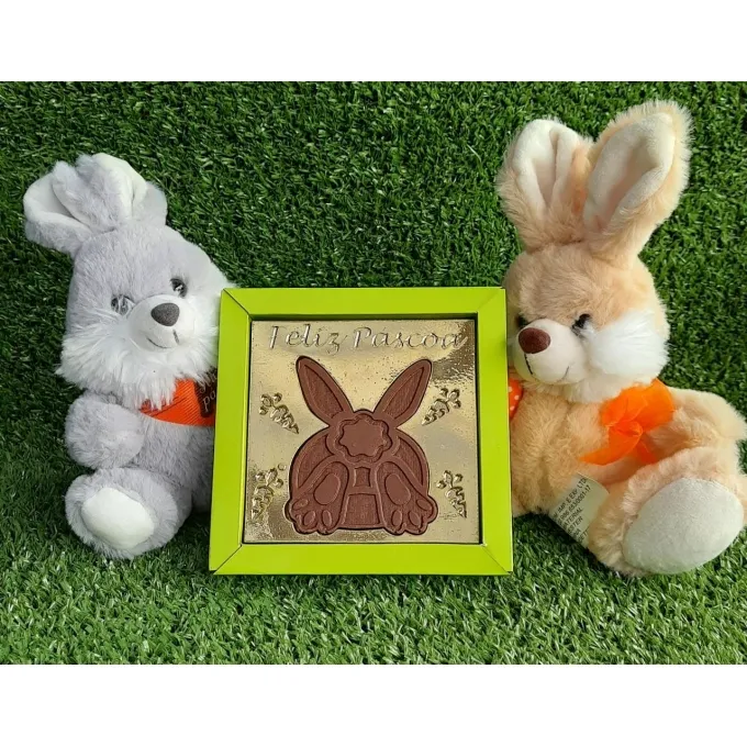 Caixa motivos páscoa com borda em papel duplex e berço ouro metalizado. Medidas internas: 15,5 x 15 x 4,5 Solicite informações sobre opções de cores e berço (Cristal, marrom, etc.) Chocolate meramente ilustrativo
