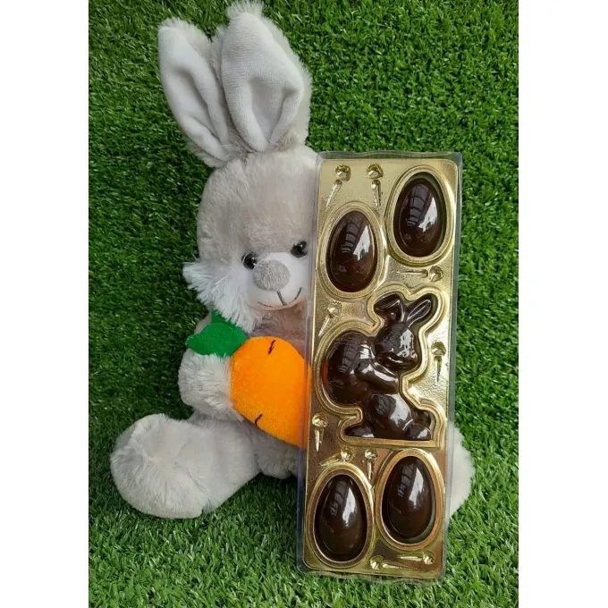 Embalagem 4 ovos 1 coelho em PET cristal e ouro metalizado. Chocolate meramente ilustrativo